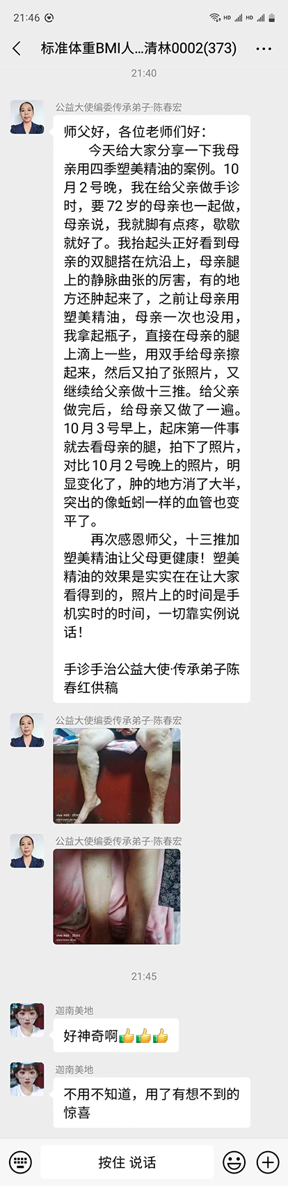今天給大家分享一下我母親用四季塑美精油的案例。10月2號晚,我在給父親做手診時(shí),要72歲的母親也一起做,母親說,我就腳有點(diǎn)疼,歇歇就好了。我抬起頭正好看到母親的雙腿搭在炕沿上,母親腿上的靜脈曲張的厲害,有的地方還腫起來了,之前讓母親用塑美精油,母親一次也沒用,我拿起瓶子,直接在母親的腿上滴上一些,用雙手給母親擦起來,然后又拍了張照片,又繼續(xù)給父親做十三推。給父親做完后,給母親又做了一遍。10月3號早上,起床第一件事就去看母親的腿,拍下了照片,對比10月2號晚上的照片,明顯變化了,腫的地方消了大半,突出的像蚯蚓一樣的血管也變平了。