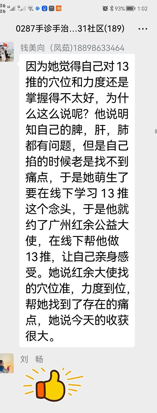 所以我覺得以后一定要把十三推掐按的手法跟那個(gè)穴位位置要糾正,還是要重新學(xué)習(xí)啊,感恩感謝紅余大使來給我親傳面授,讓我感受到了自己做的還不到位,我會(huì)堅(jiān)持做十三推,并用好精油,我相信,我的身體會(huì)越來越好的,我現(xiàn)在非常有信心,感恩澤龍?jiān)洪L、感恩周老師、曲偉老師、感恩紅余和美向大使,感恩你們對(duì)我的幫助,愿更多人受益于十三推”。