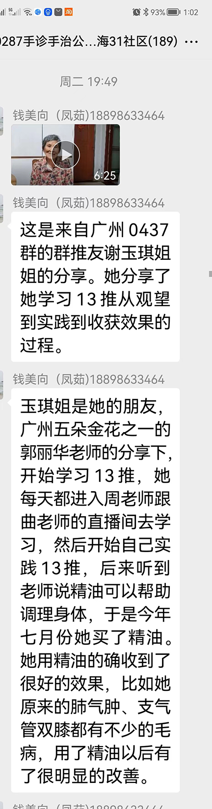 “我來自廣州的0437群,叫謝玉琪,今年80多歲了,以前學(xué)過手診,剛學(xué)十三推時(shí),我沒有重視,因?yàn)槿思医榻B給我的時(shí)候,我就覺得跟以前學(xué)的那些養(yǎng)生方法差不多,好像也沒什么,只是想先看看,后來,我試著一掐了掐13推的穴位,咦,好像是有點(diǎn)作用哎,于是我就開始掐按了,主要是看了周老師那個(gè)直播來學(xué)習(xí)掐按穴位,還有就是聽人家推友的反應(yīng)和分享,就是那種觀望的態(tài)度。