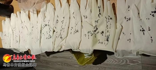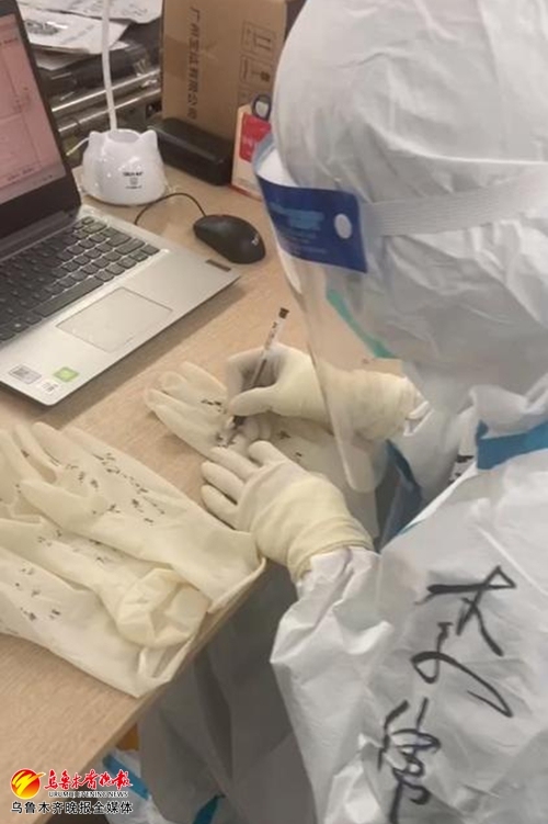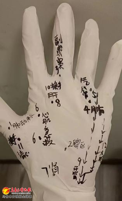 山東援疆醫(yī)療隊(duì)聊城市人民醫(yī)院隊(duì)員在抽檢手套上把穴位寫(xiě)出來(lái)并標(biāo)上序號(hào)。受訪者供圖